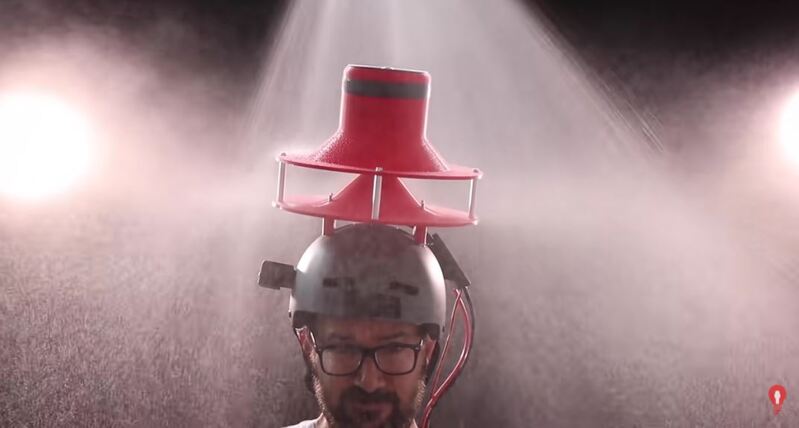 頭に装着したマシンが、落ちてくる雨を高速エアで吹き飛ばします。